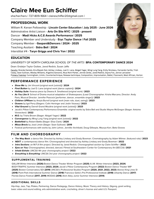 Claire Mee Eun Schiffer (she/her) is a South Korean adoptee and a graduate from the University of North Carolina School of the Arts with a BFA in Contemporary Dance. She is currently a Kenan Fellow at Lincoln Center Education, working administratively at Arts On Site NYC (a women run non-profit arts organization), and a freelance performer based in New York City. She was a company member of Gaspard&Dancers for two seasons and traveled with the company to perform in Yerevan, Armenia, Tbilisi, Georgia, and all over North Carolina.